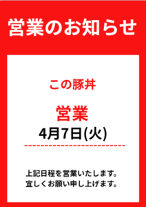 4月7日 火曜日は、営業いたします。